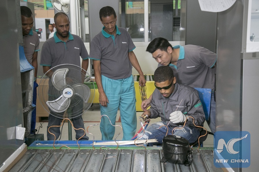 Workers are seen at a Hisense plant in Atlantis near Cape Town, South Africa, on March 18, 2019. South African Minister of Trade and Industry Rob Davies on Monday lauded Chinese electronic giant Hisense for its contribution to the economic development in the African country. (Xinhua/Fred Barker)