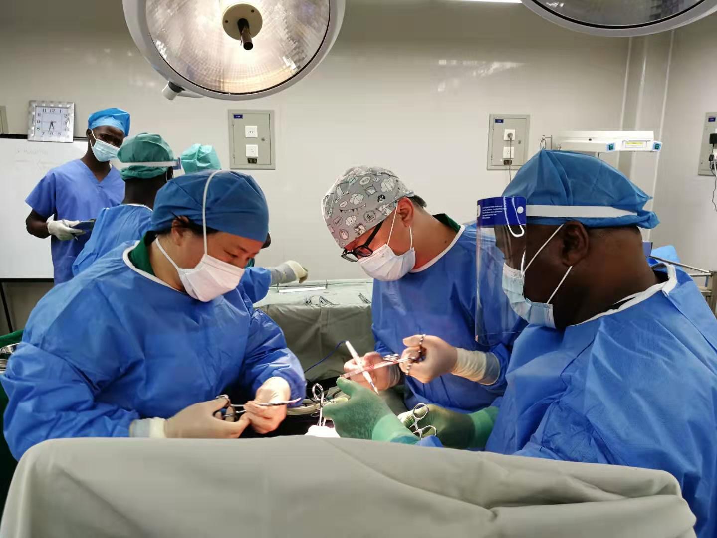 Chinese medical team members and local doctors perform surgery at the Sierra Leone-China Friendship Hospital in Jui, western area of Sierra Leone, Aug. 6, 2019. (Xinhua)