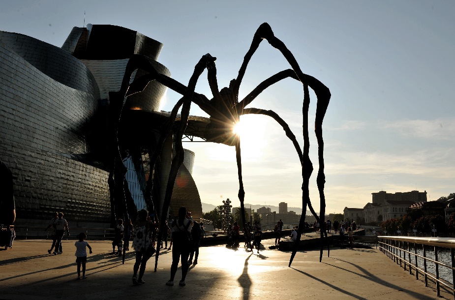 People are seen at the square outside Bilbao Guggenheim Museum in Bilbao, Spain, Aug. 23, 2019. (Xinhua/Guo Qiuda)