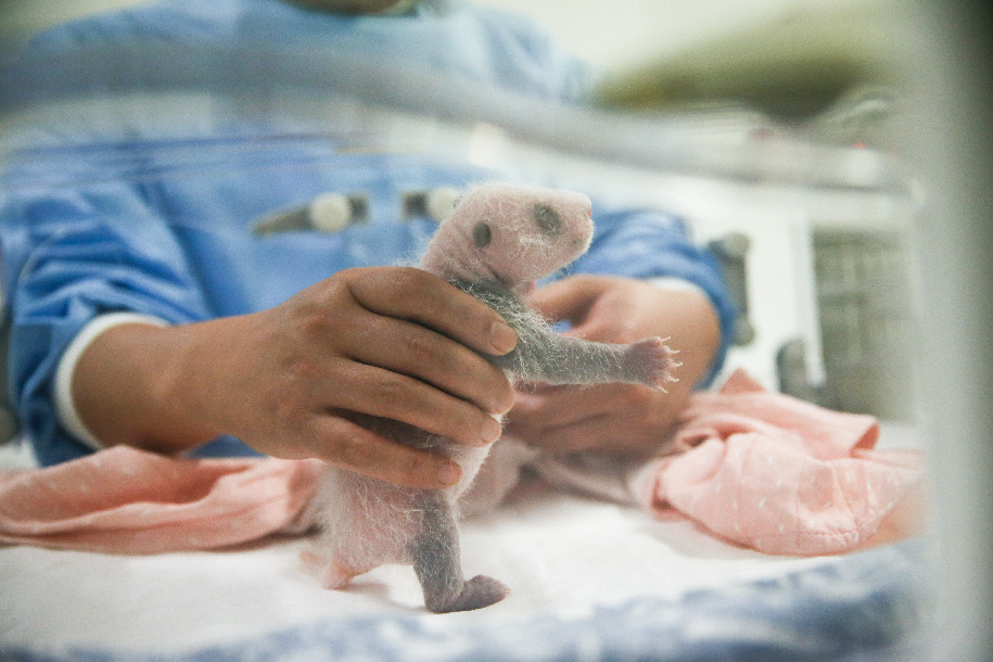 A keeper takes care of the female cub of panda Hao Hao during a media view at Pairi Daiza zoo in Brugelette, Belgium, Aug. 24, 2019. (Xinhua/Zheng Huansong)