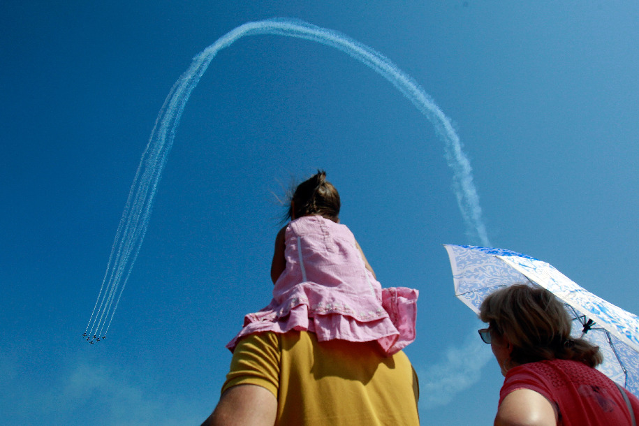 People watch the Bucharest International Air Show in Bucharest, Romania, on Aug. 24, 2019. (Photo by Cristian Cristel/Xinhua)