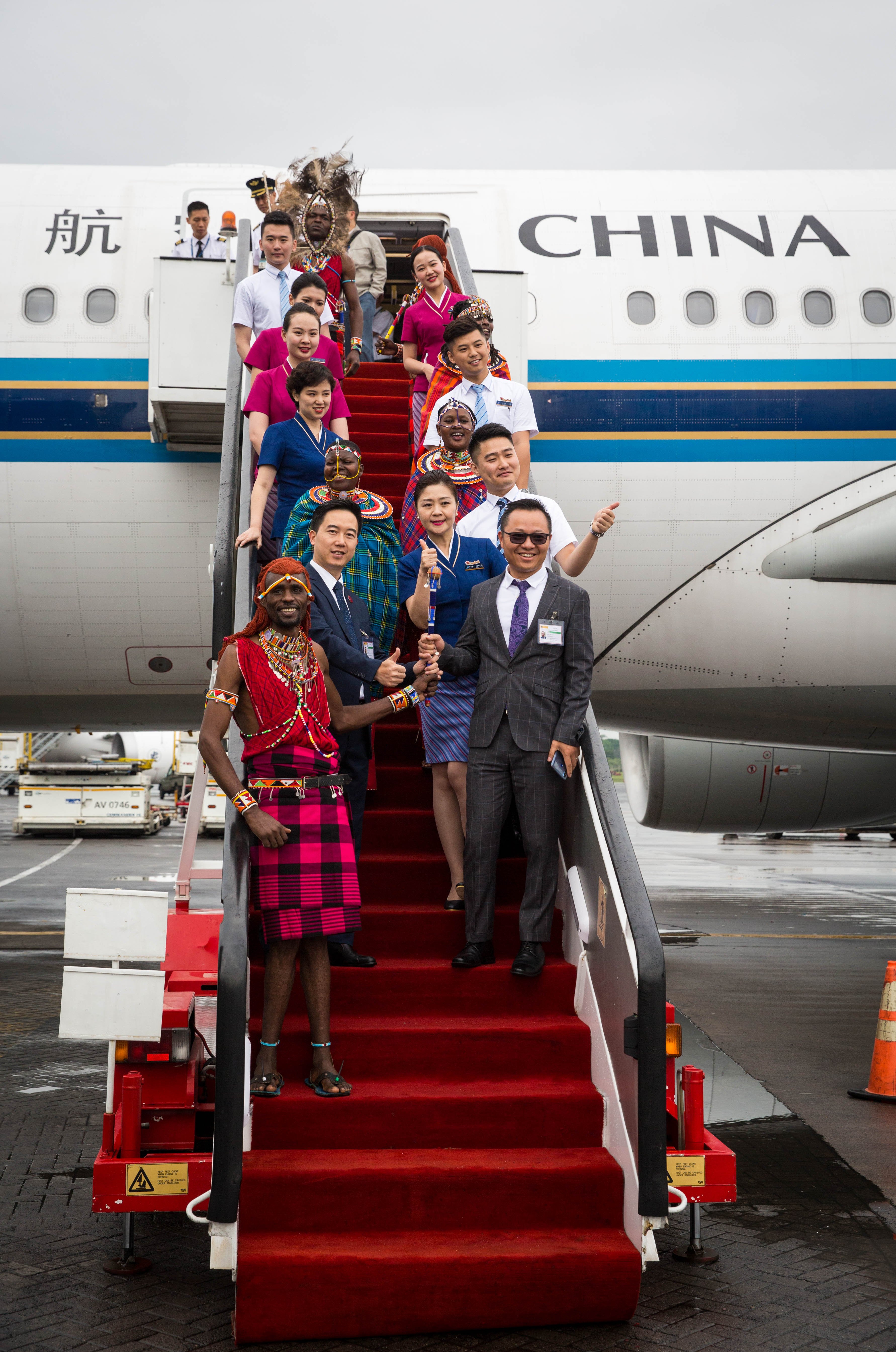 BEIJING, Sept. 3, 2019 (Xinhua) -- People pose for a photo at a welcome ceremony for the inaugural Changsha-Nairobi flight at Jomo Kenyatta International Airport in Nairobi, Kenya, June 12, 2019. (Xinhua/Lyu Shuai)