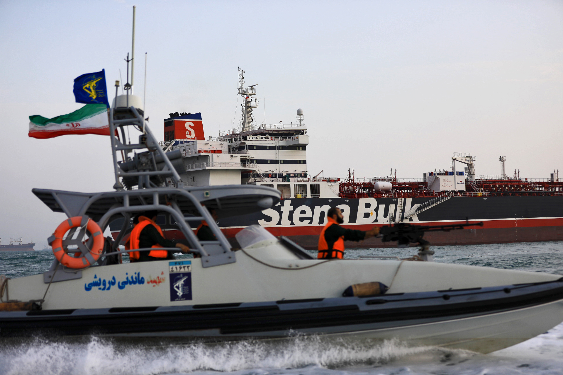 The photo released on July 21, 2019 shows the British oil tanker "Stena Impero" surrounded by Iranian Revolutionary Guard near the Strait of Hormuz, Iran. (Morteza Akhoundi/ISNA/Handout via Xinhua)