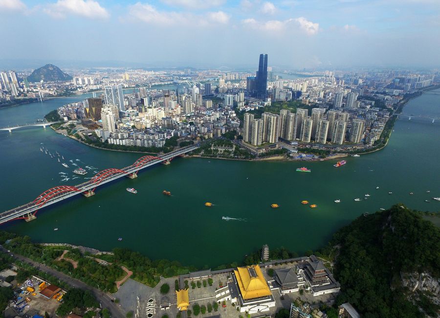 Aerial photo taken on Oct. 1, 2016 shows boats cruising on the Liujiang River in Liuzhou City, south China's Guangxi Zhuang Autonomous Region. (Xinhua/Li Bin)