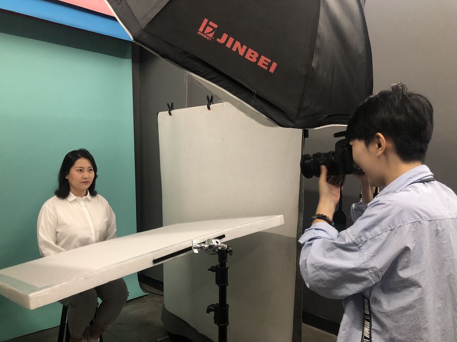 A woman poses for an ID photo in a studio. (Photo by Mi Lingzi)