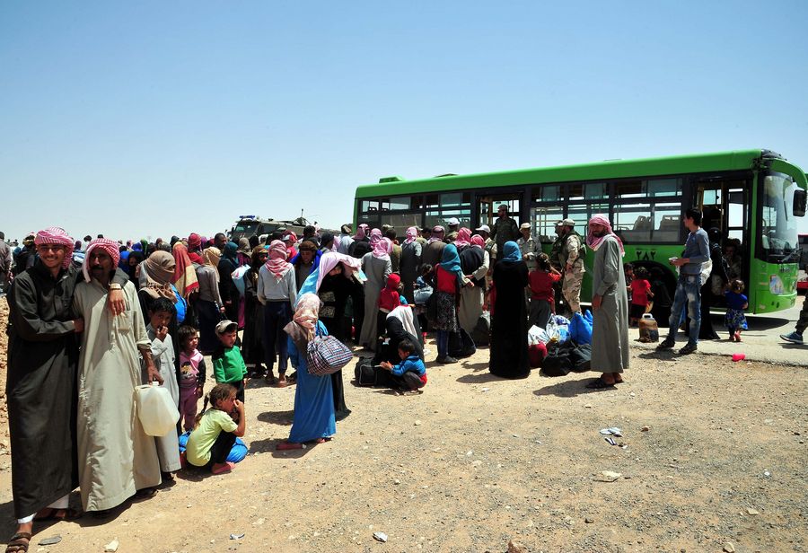 Syrian refugees arrive at the Jlaighem crossing in the eastern countryside of Homs Province, Syria, on June 26, 2019. (Xinhua/Ammar Safarjalani)