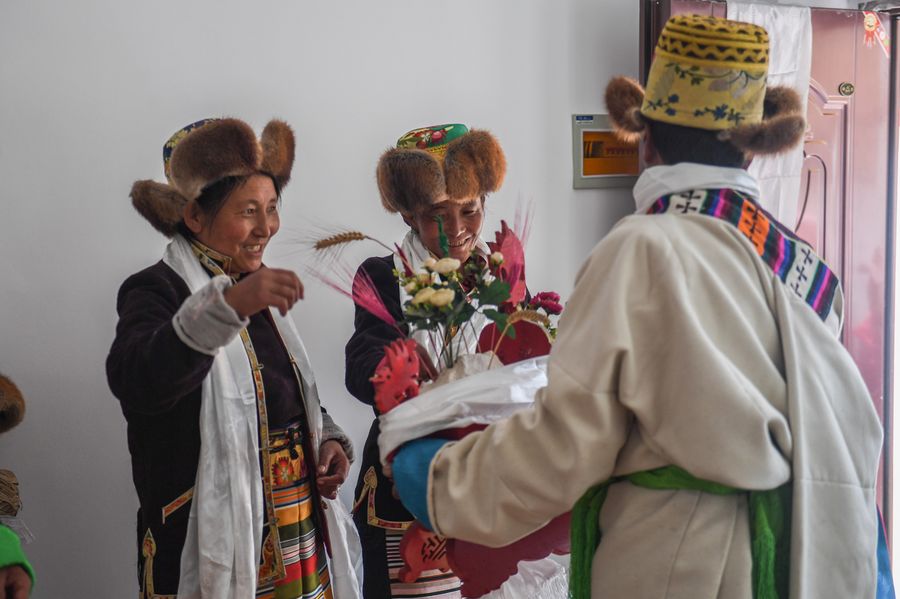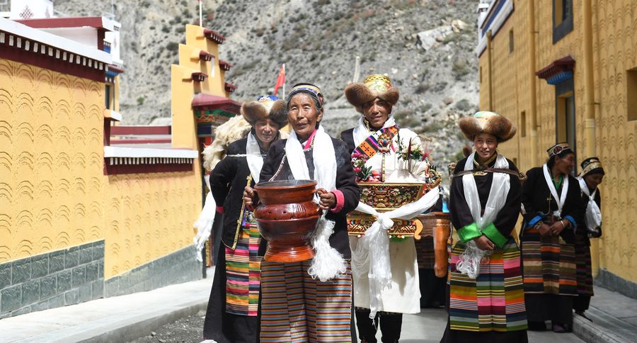 Villager Dainzin Quzhen (front) holds a traditional rite in front of her new house in Lhozhag Town of Lhozhag County, Shannan City, Sept. 21, 2019. (Xinhua/Jigme Dorje)