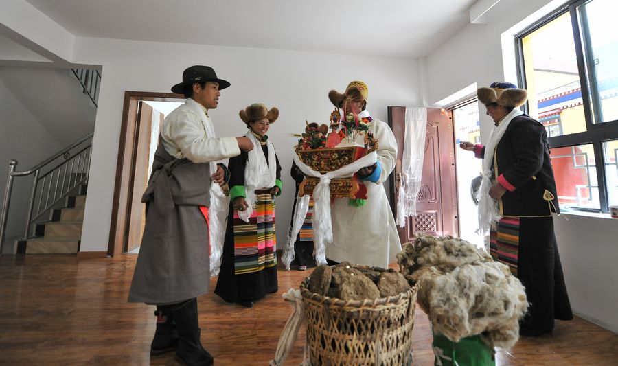Dainzin Quzhen (front) holds a traditional rite with family members before moving into her new house in Lhozhag Town of Lhozhag County, Shannan City, Sept. 21, 2019. (Xinhua/Jigme Dorje)