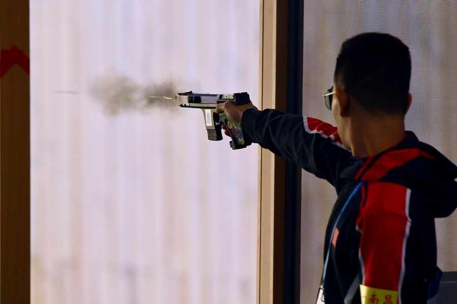 Gao Zheng of China competes during the team competition of the Men's 25m Military Rapid Fire Pistol of the 7th CISM Military World Games in Wuhan, capital of central China's Hubei Province, Oct. 19, 2019. (Xinhua/Jiang Kehong)