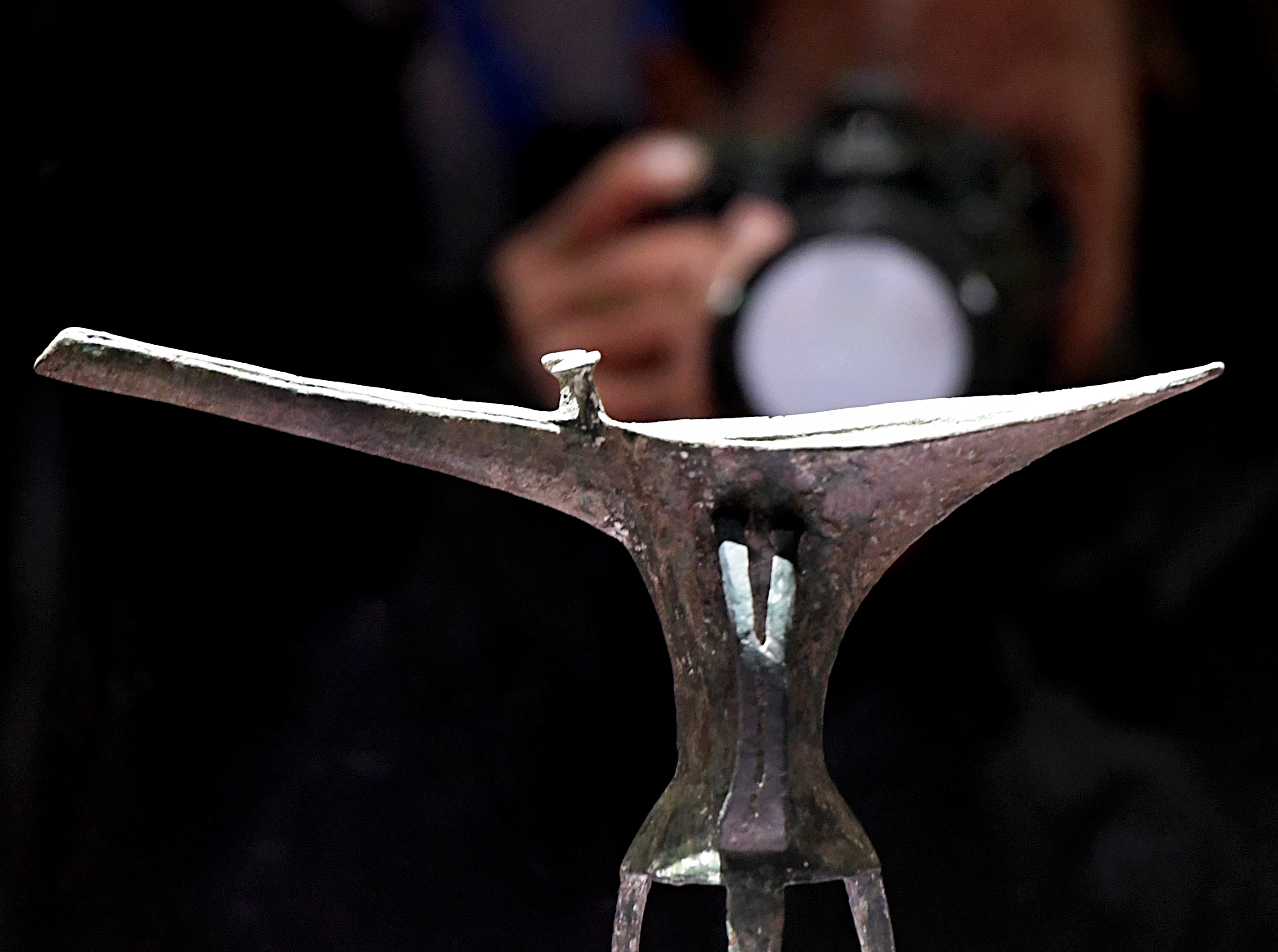 A visitor takes pictures of a bronze ware exhibit at the Erlitou Relic Museum in Luoyang, central China's Henan Province, Oct. 19, 2019. (Xinhua/Li An)