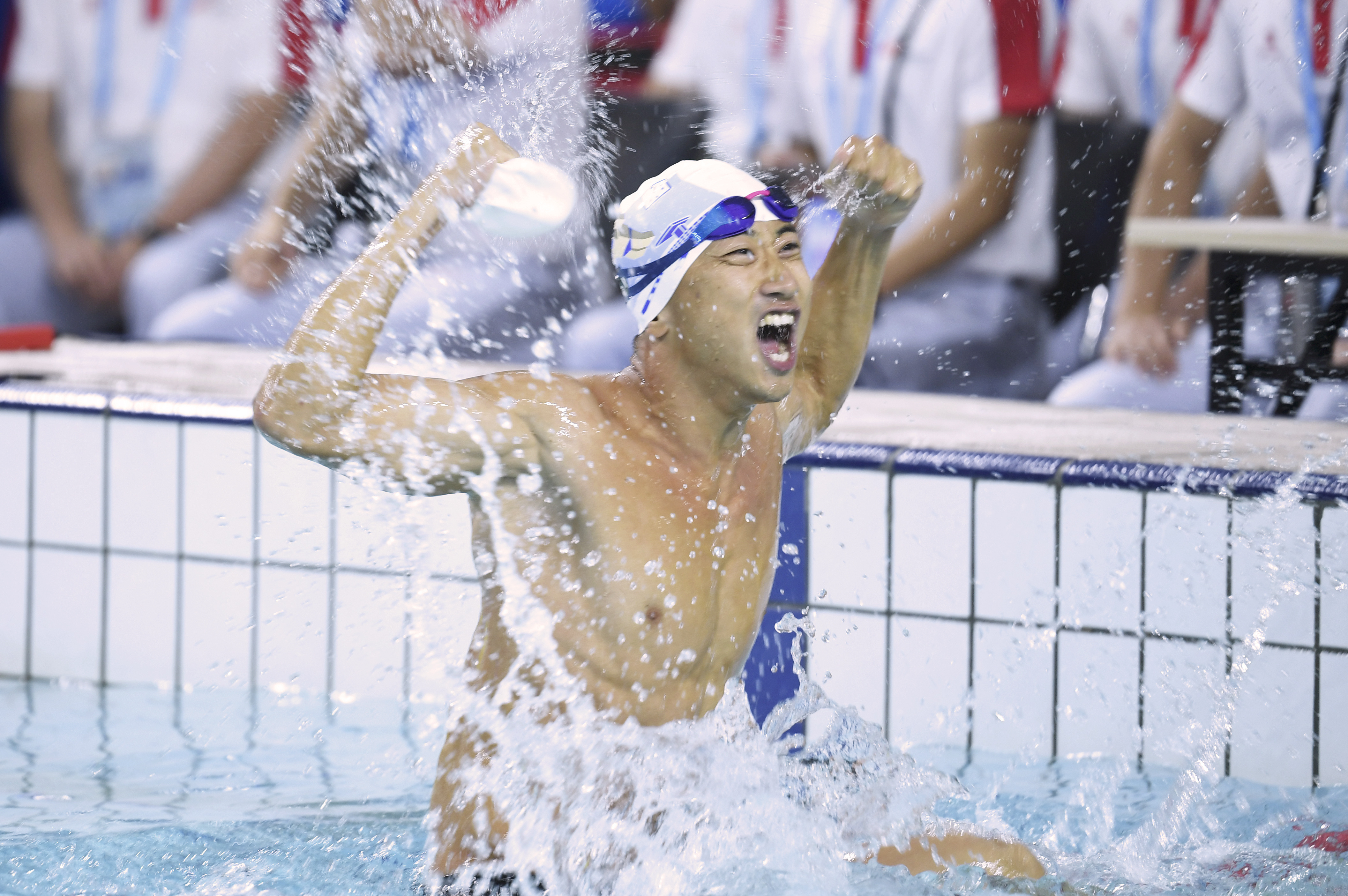 Zhang Zheng celebrates after winning the men's individual obstacle swimming gold medal in a world record-tying 23.8 seconds at the 7th CISM Military World Games in Wuhan, capital of central China's Hubei Province, Oct. 21, 2019. (Xinhua/Fan Peishen)