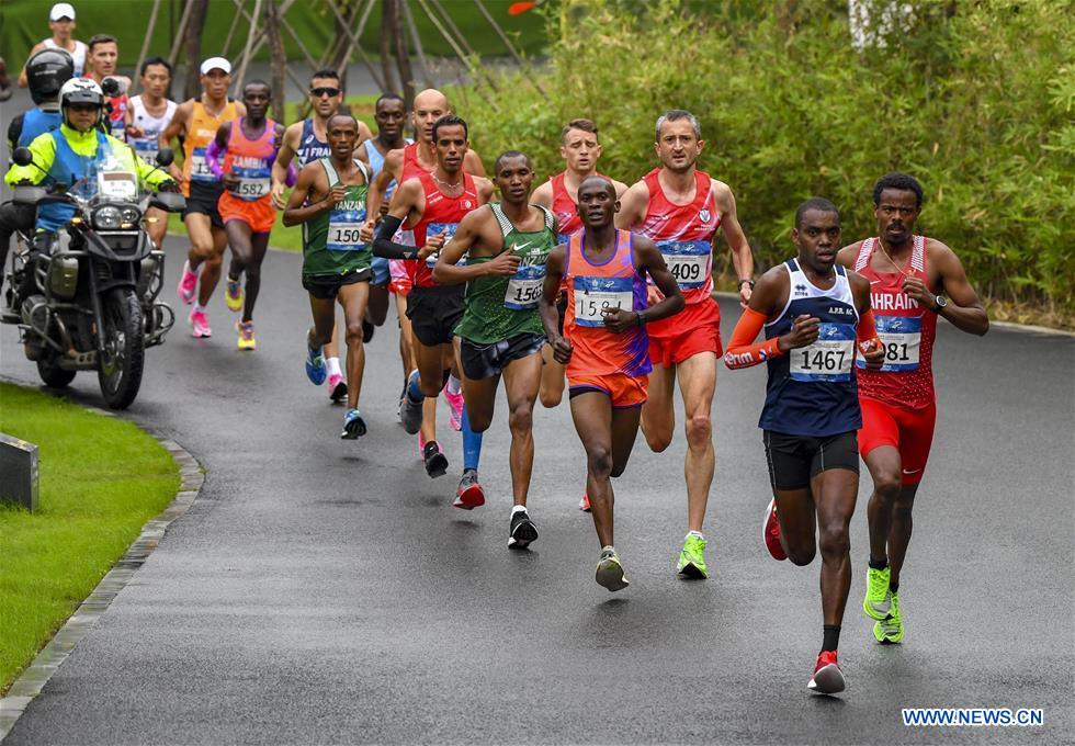 Athletes compete during the men's marathon individual final of track and field at the 7th CISM Military World Games in Wuhan, capital of central China's Hubei Province, Oct. 27, 2019. (Xinhua/Hu Huhu)