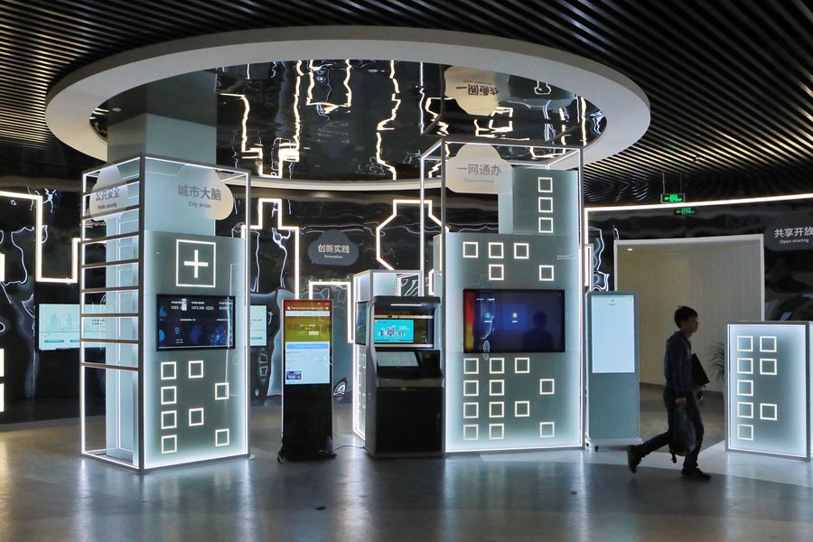A visitor tours a display center of the National Big Data Comprehensive Pilot Area in southwest China's Guizhou Province, May 22, 2019. (Xinhua/Ou Dongqu)