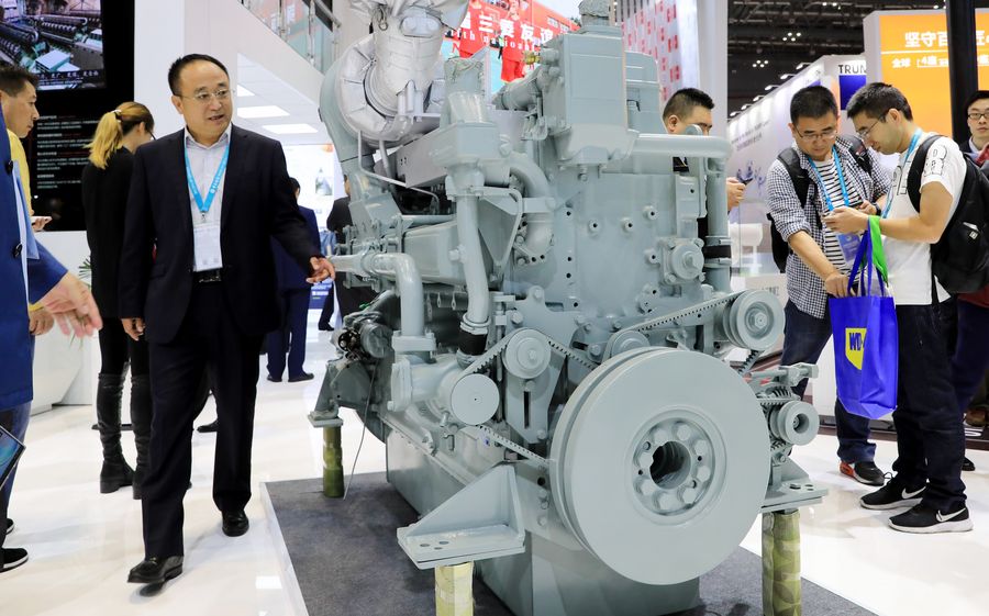 An eco-friendly diesel-powered generator produced by Mitsubishi Heavy Industries is seen at the Equipment exhibition area during the second China International Import Expo (CIIE) in Shanghai, east China, Nov. 6, 2019. The National Exhibition and Convention Center in Shanghai greeted a large number of visitors on the second day of the CIIE. (Xinhua/Fang Zhe)