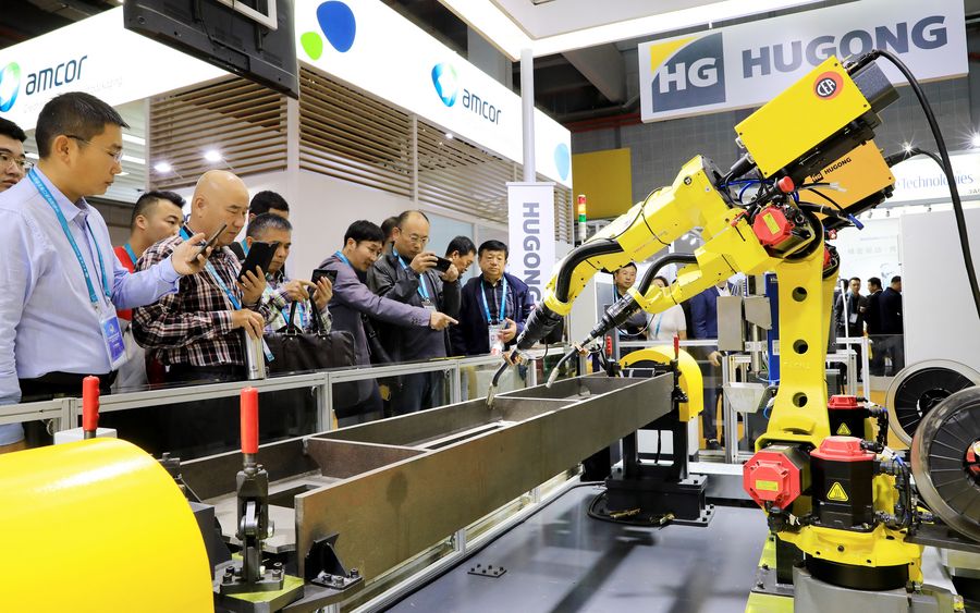People watch welding robots operating at the Equipment exhibition area during the second China International Import Expo (CIIE) in Shanghai, east China, Nov. 6, 2019. The National Exhibition and Convention Center in Shanghai greeted a large number of visitors on the second day of the CIIE. (Xinhua/Fang Zhe)