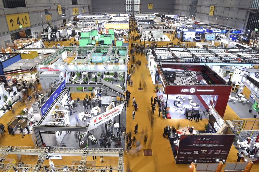 People visit the Equipment exhibition area during the second China International Import Expo (CIIE) in Shanghai, east China, Nov. 7, 2019. The second CIIE is held from Nov. 5 to Nov. 10. (Xinhua/Wang Peng)