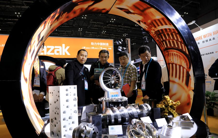 People visit the booth of Mazak at the Equipment exhibition area during the second China International Import Expo (CIIE) in Shanghai, east China, Nov. 6, 2019. The National Exhibition and Convention Center in Shanghai greeted a large number of visitors on the second day of the CIIE. (Xinhua/Fang Zhe)
