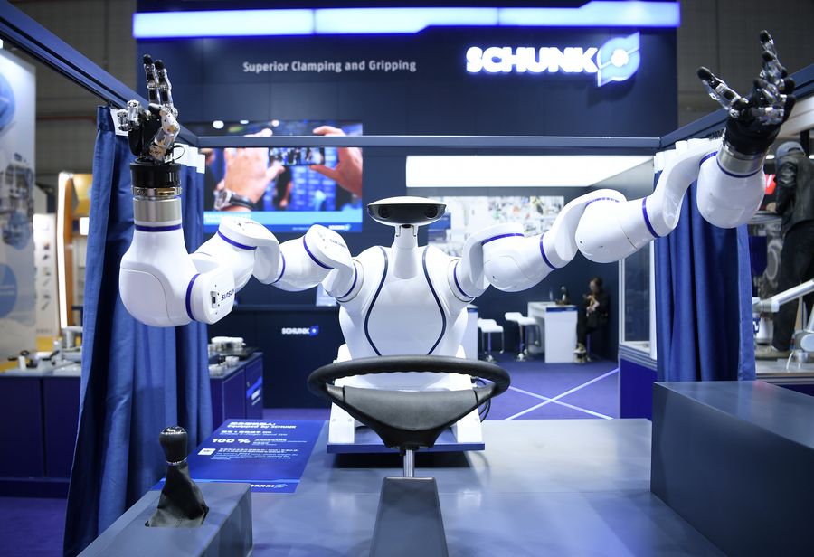 Photo taken on Nov. 5, 2019 shows a service robot at the booth of Schunk at the Equipment exhibition area during the second China International Import Expo (CIIE) in Shanghai, east China. The second CIIE kicked off Tuesday at the National Exhibition and Convention Center in Shanghai. (Xinhua/Wang Peng)