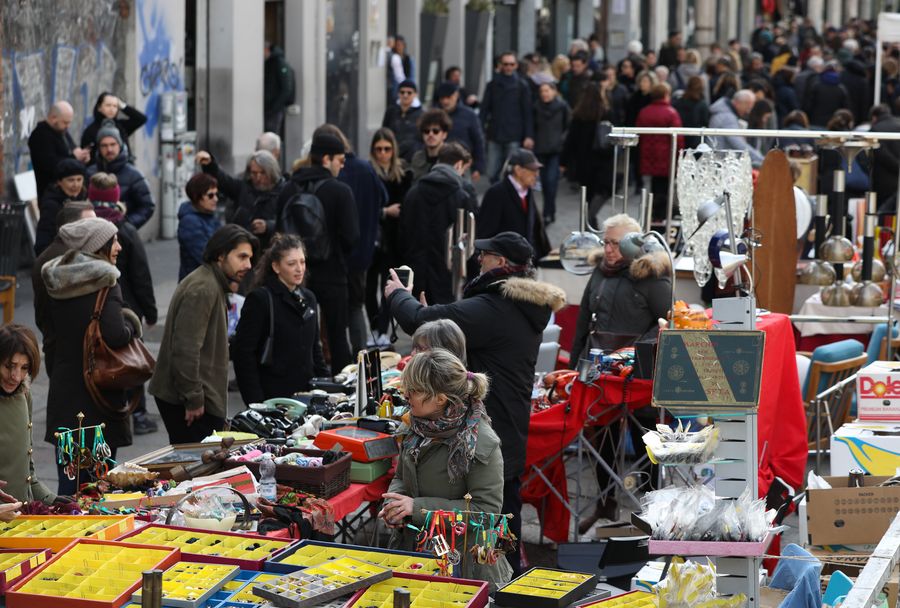 MILAN, Feb. 25, 2019 (Xinhua) -- People visit the antique market along the Naviglio Grande in Milan, Italy, Feb. 24, 2019. (Xinhua/Cheng Tingting)