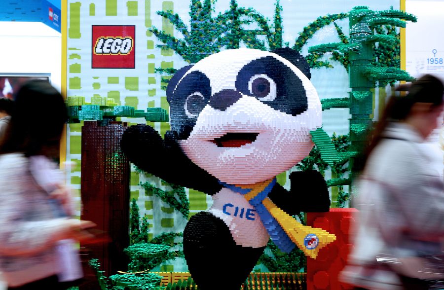 People walk past Jinbao, mascot of the China International Import Expo (CIIE), which is made of Lego bricks, at the Lifestyles exhibition area of the second China International Import Expo (CIIE) in Shanghai, east China, Nov. 9, 2019. (Xinhua/Liu Ying)