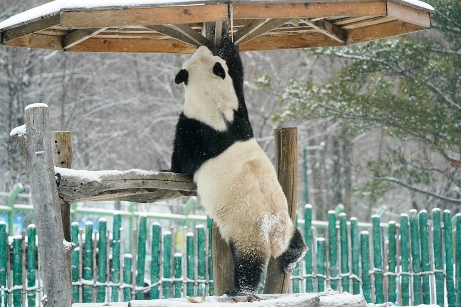 Giant panda Sijia plays in a snow-covered pavilion outside the panda house in the ski resort of Yabuli in Shangzhi County, northeast China's Heilongjiang Province, Nov. 13, 2019. (Xinhua/Wang Song)