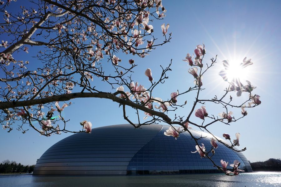 Photo taken on March 12, 2019 shows Yulan magnolia flowers in front of the National Center for the Performing Arts (NCPA) in Beijing, capital of China. (Xinhua/Ju Huanzong)