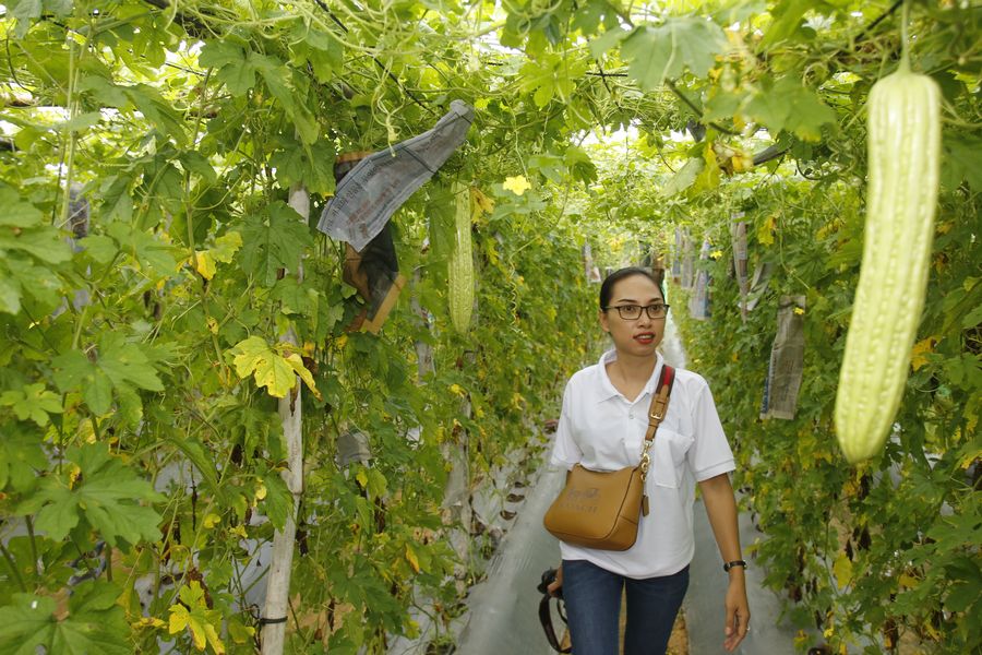 A woman walks in a vegetable farm during the celebration of the World Food Day in Pursat province, Cambodia on Oct. 19, 2019. (Photo by Sovannara/Xinhua)