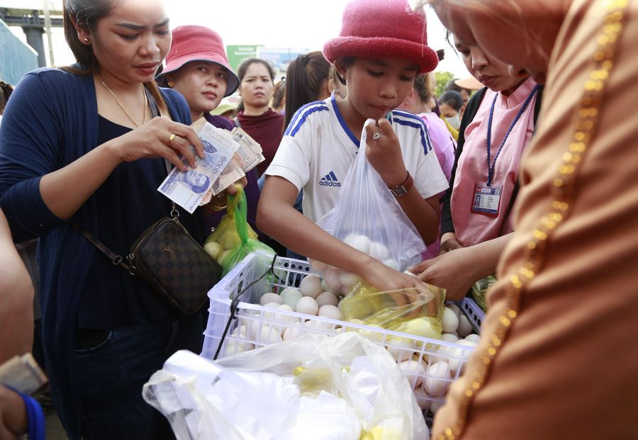 Cambodian garment workers buy eggs in front of a factory in Phnom Penh, Cambodia, on Sept. 20, 2019, after the Cambodian government set a new monthly minimum wage for the country's garment and footwear industries. (Photo by Phearum/Xinhua)