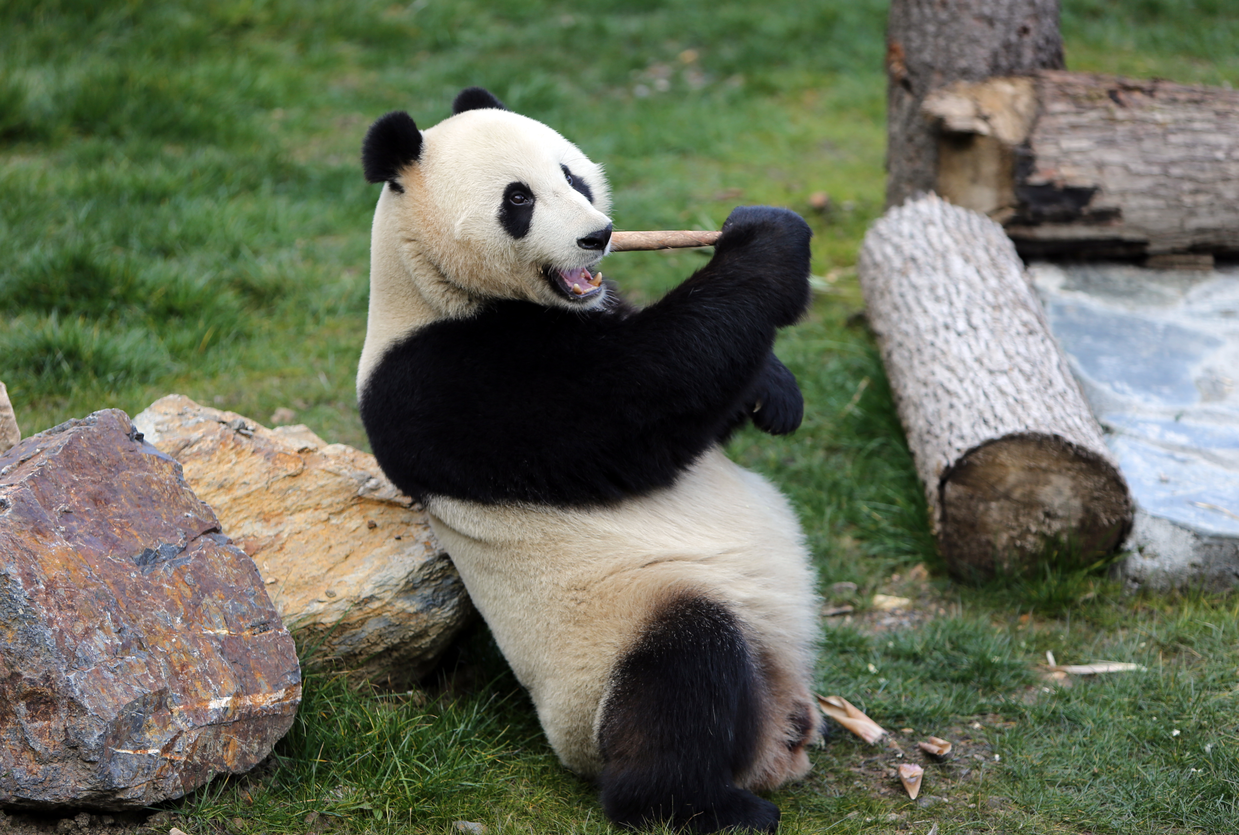 A giant panda is seen feeding itself in the newly-opened Jiawuhai Giant Panda Conservation and Research Park in Jiuzhaigou County, southwest China's Sichuan Province, Nov. 7, 2019. (Xinhua/Li Mengxin)