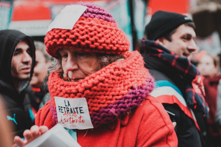 A woman takes part in a demonstration in Paris, France, on Dec. 5, 2019.(Photo by Yu Zhou/Xinhua)