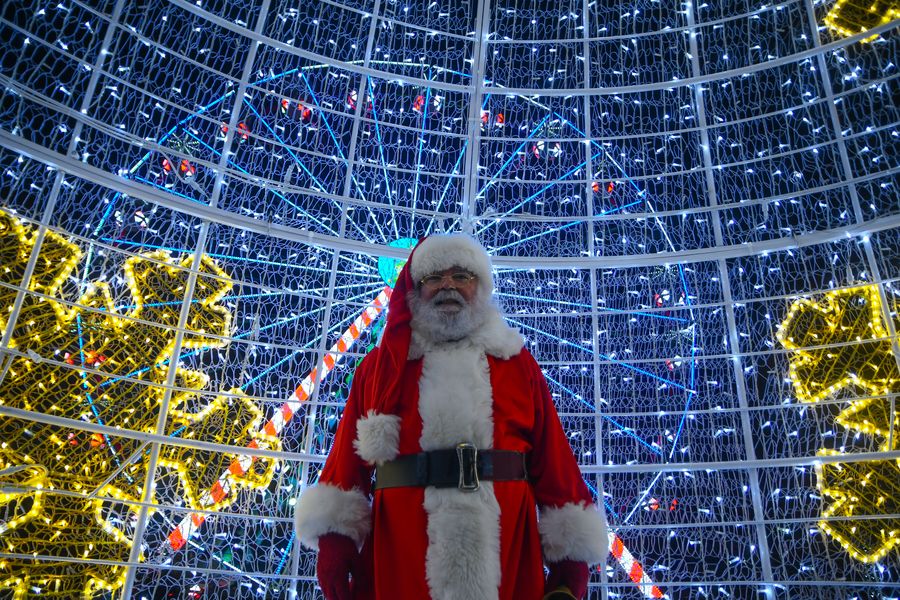 A man dressed as Santa Claus stands in front of colorful Christmas lights in Valletta, Malta. (Photo by Jonathan Borg/Xinhua)