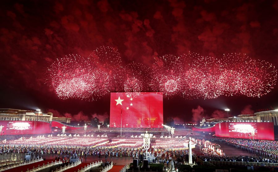 Fireworks explode during a grand evening gala marking the 70th founding anniversary of the People's Republic of China (PRC) in Beijing, capital of China, Oct. 1, 2019. (Photo by Sheng Jiapeng/Xinhua)