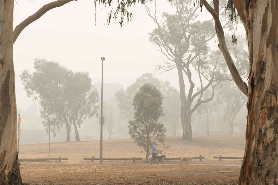 A pedestrian walks in a shroud of smoke near the Australian War Memorial in Canberra, Australia on Jan. 1, 2020. The smoke is caused by bushfires. (Photo by Liu Changchang/Xinhua)