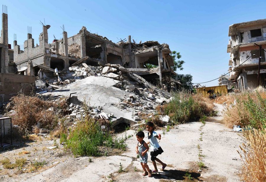 Children of Kamal Shtaiwi play near their house in the Wadi al-Sayeh street in the central city of Homs, Syria, May 29, 2019. Kamal Shtaiwi, 58, enjoys returning to his home with his wife and four children, even though it is surrounded by the destruction of war. (Xinhua/Ammar Safarjalani)