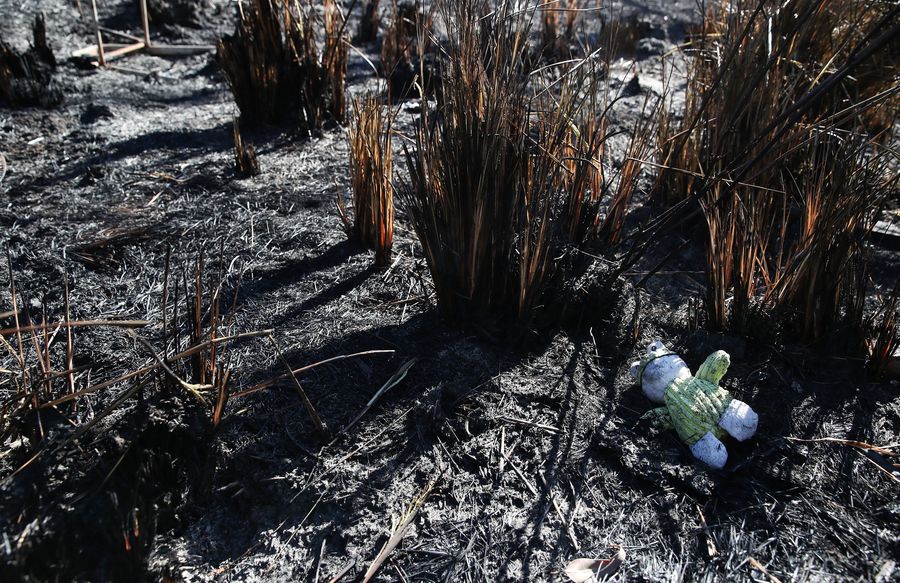 A doll lies on the field where a farmhouse was burnt by bushfires near Newcastle, New South Wales, Australia, Nov. 10, 2019. (Xinhua/Bai Xuefei)