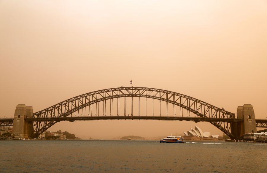 Photo taken on Nov. 12, 2019 shows the Sydney Harbour Bridge covered in smog which was caused by bushfires in northern New South Wales in Australia. (Xinhua/Bai Xuefei)