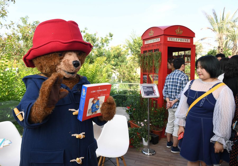 A staff member wearing a Paddington bear costume interacts with visitors during the "Britain Day" event at the Beijing International Horticultural Exhibition in Beijing, capital of China, Sept. 17, 2019.(Xinhua/Ren Chao)