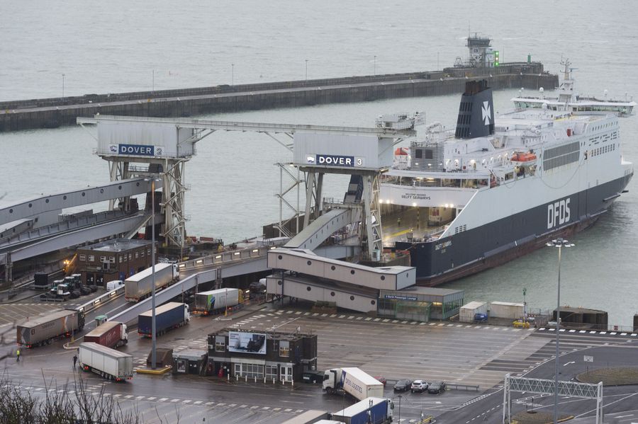 Cars and trucks embark on a ferry in Port of Dover on the first day after Brexit in Dover, Britain, Feb. 1, 2020. (Photo by Ray Tang/Xinhua)