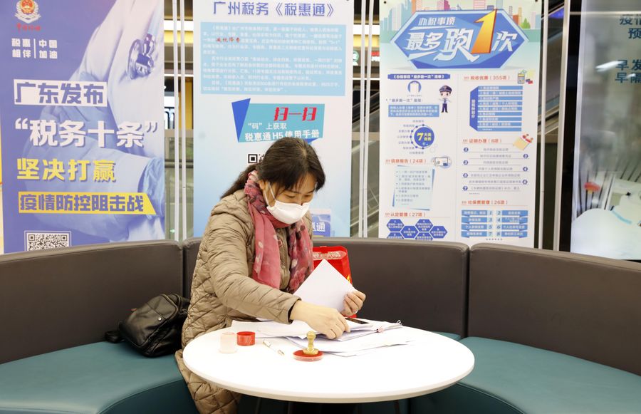 A woman prepares paperwork at a tax service center in Panyu District of Guangzhou, south China's Guangdong Province, Feb. 7, 2020. (Xinhua/Huang Guobao)