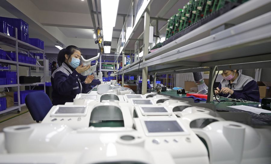 Workers produce non-invasive ventilators at a medical technology company in Shenyang, northeast China's Liaoning Province, Jan. 31, 2020. (Xinhua/Yang Qing)