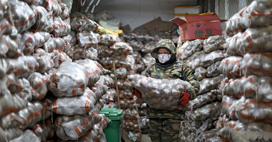 A worker carries potatoes at a wholesale market, which stays in business amid the current novel coronavirus outbreak, in Shenyang, northeast China's Liaoning Province, Feb. 4, 2020. (Xinhua/Yao Jianfeng)