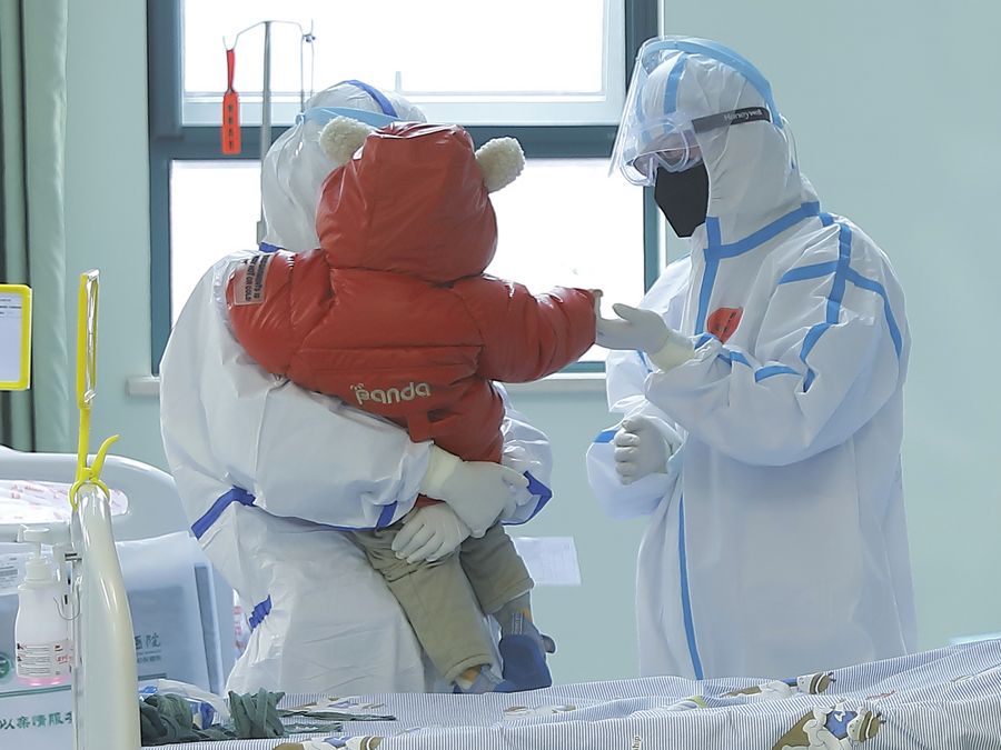 A medical staff holds a 14-month-old baby recovered from novel coronavirus pneumonia before his discharge from the Wuhan Children's Hospital in Wuhan, capital of central China's Hubei Province, Feb. 13, 2020.(Wuhan Children's Hospital/Handout via Xinhua)
