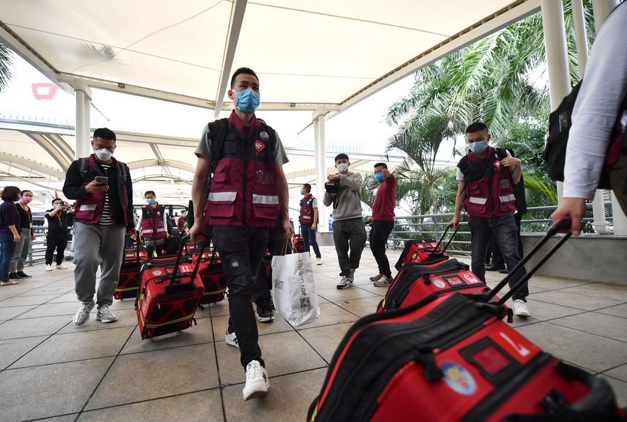 Medical team members leave for Hubei Province at the Haikou Meilan International Airport in Haikou, south China's Hainan Province, Feb. 14, 2020. (Xinhua/Guo Cheng)