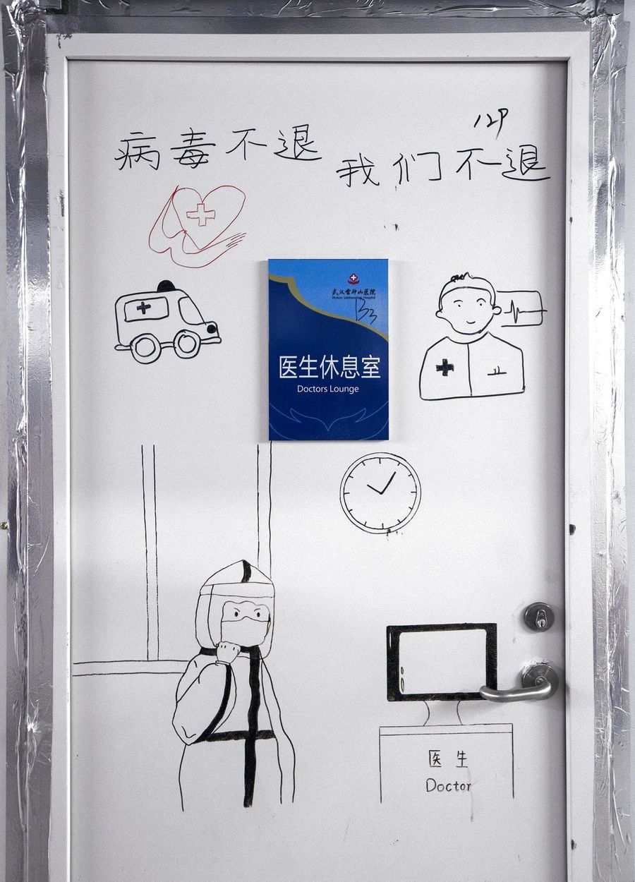 Photo taken on March 4, 2020 shows a cartoon on a door in a corridor at the Leishenshan (Thunder God Mountain) Hospital in Wuhan, central China's Hubei Province. (Xinhua/Fei Maohua)