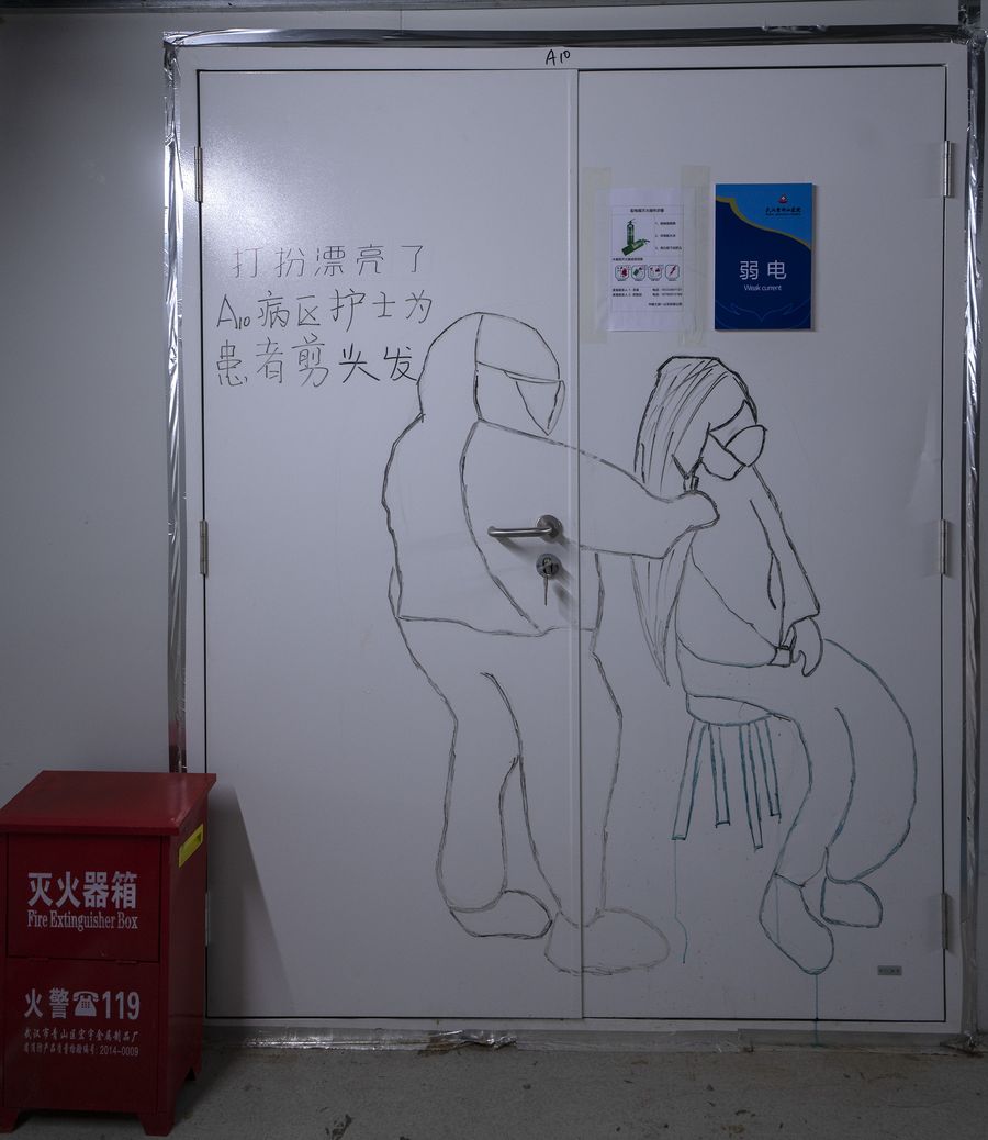 Photo taken on March 4, 2020 shows a cartoon on a door in a corridor at the Leishenshan (Thunder God Mountain) Hospital in Wuhan, central China's Hubei Province. The picture shows a medical worker is cutting hair for a patient. (Xinhua/Fei Maohua)