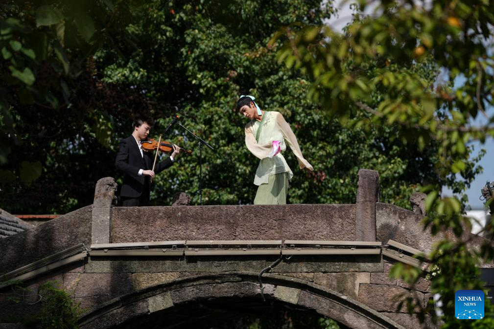 A dancer performs on an ancient bridge during a dance festival in the ancient town of Xinshi of Deqing County, east China's Zhejiang Province, on Oct. 24, 2025. (Xinhua/Huang Zongzhi)