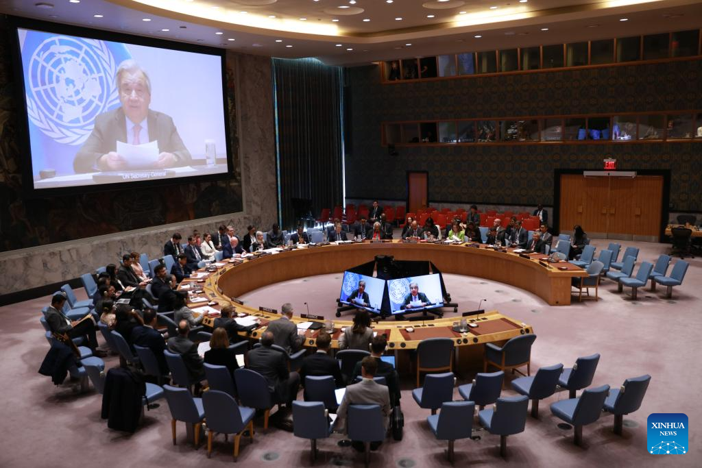UN Secretary-General Antonio Guterres (on screens) speaks via a video link at an open debate of the Security Council on the future of the UN at the UN headquarters in New York, Oct. 24, 2025. Guterres called on the Security Council to channel the resources often spent on war to development and peace on Friday. (Xinhua/Xie E)