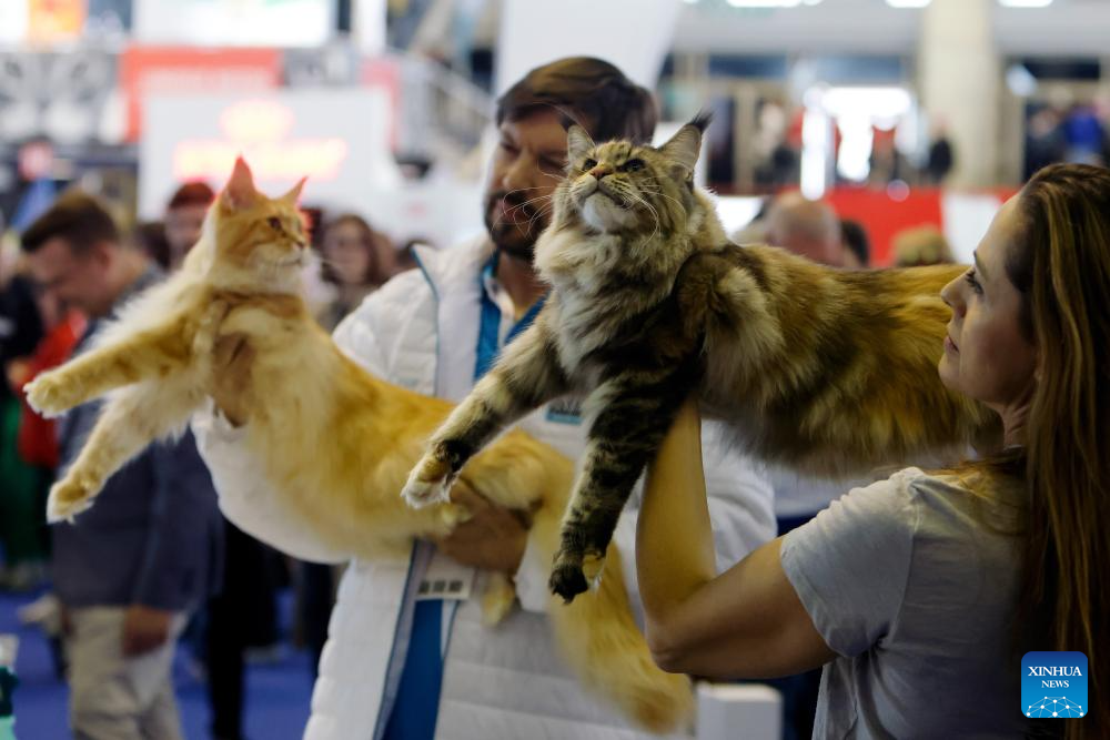 Maine Coon cats are being judged during the Worldshow Romania 2025 feline championship at Romexpo in Bucharest, Romania, Oct. 25, 2025. More than 1,000 cats from more than 30 countries participated in the two-day feline beauty contest. (Photo by Cristian Cristel/Xinhua)