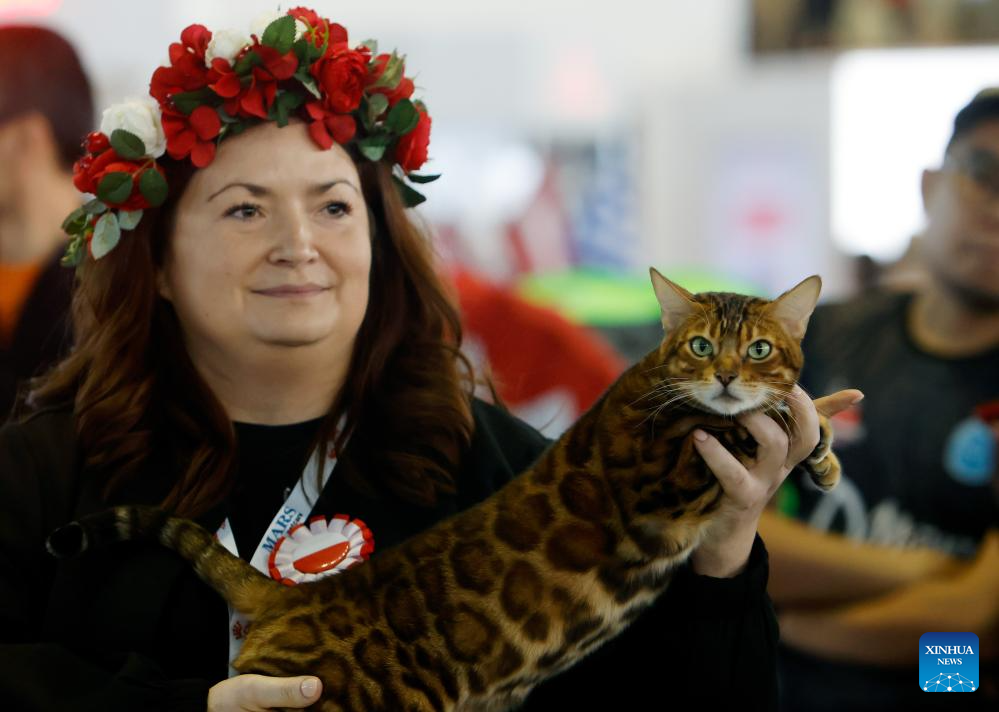 A Bengal cat is being judged during the Worldshow Romania 2025 feline championship at Romexpo in Bucharest, Romania, Oct. 25, 2025. More than 1,000 cats from more than 30 countries participated in the two-day feline beauty contest. (Photo by Cristian Cristel/Xinhua)