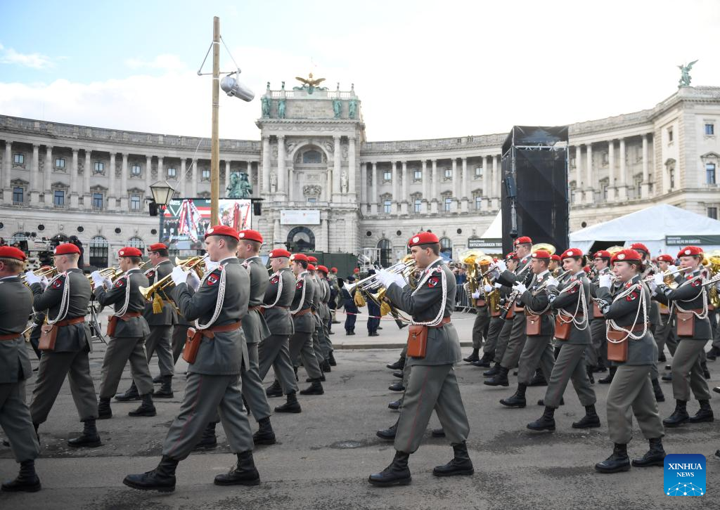 Members of Austrian military music band attend the National Day celebrations in Vienna, Austria, on Oct. 26, 2025. (Xinhua/He Canling)